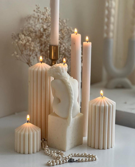 Dekoratif Mum Taş üstünde oturan kadın +Çokgen 20+15+10 CM +3 Adet Şamdanlık mum Toplam 7 Parça