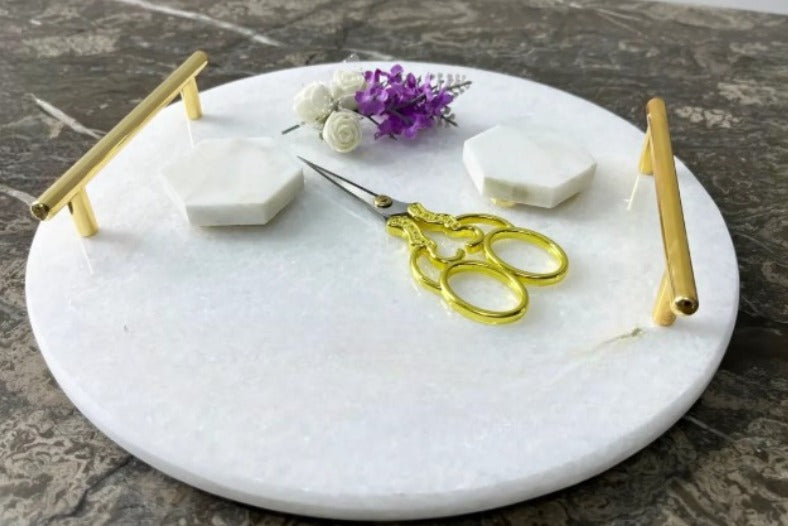 Doğal Beyaz Mermer Nişan / Söz Tepsisi Yuvarlak - Yüzük Yükselticisi Ve Makas Gold Sade Beyaz
