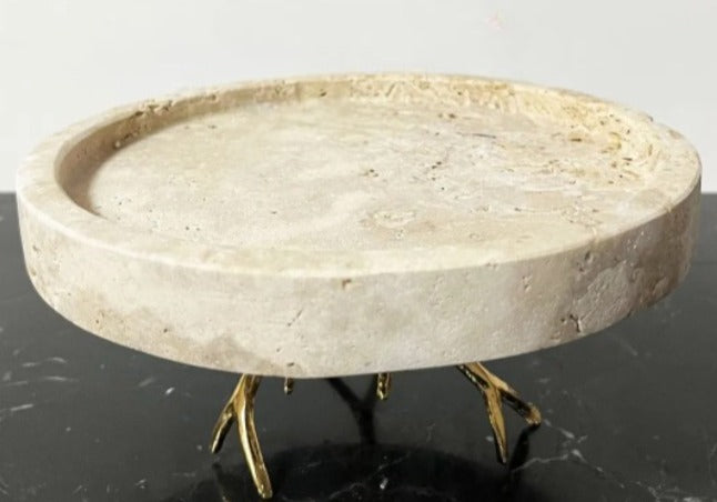 Doğal Traverten Mermer Ayaklı Sunum, Mermer Gold Ayaklı Tepsi 20cm
