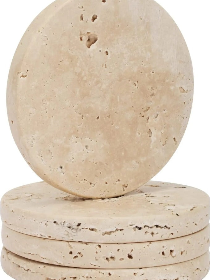 Doğal Traverten Mermer Bardak Altlığı 4'lü Yuvarlak Traverten Mermer 15 Cm