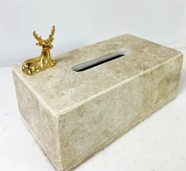 Doğal Traverten Mermer Peçetelik -mendil Kutusu - Peçete Kutusu Gold Oturan Geyik